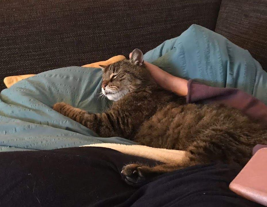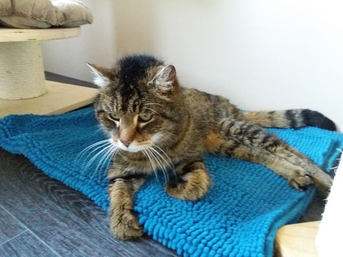 Kater Moritz lebte seit Jahren in einem Schrebergarten bei Freunden von uns. Da er so extrem verschmust und anhänglich ist, langweilte er sich aber gerade im Winter oft ohne die menschliche Gesellschaft. Deshalb durfte Moritz jetzt zu uns in die Vermittlung.