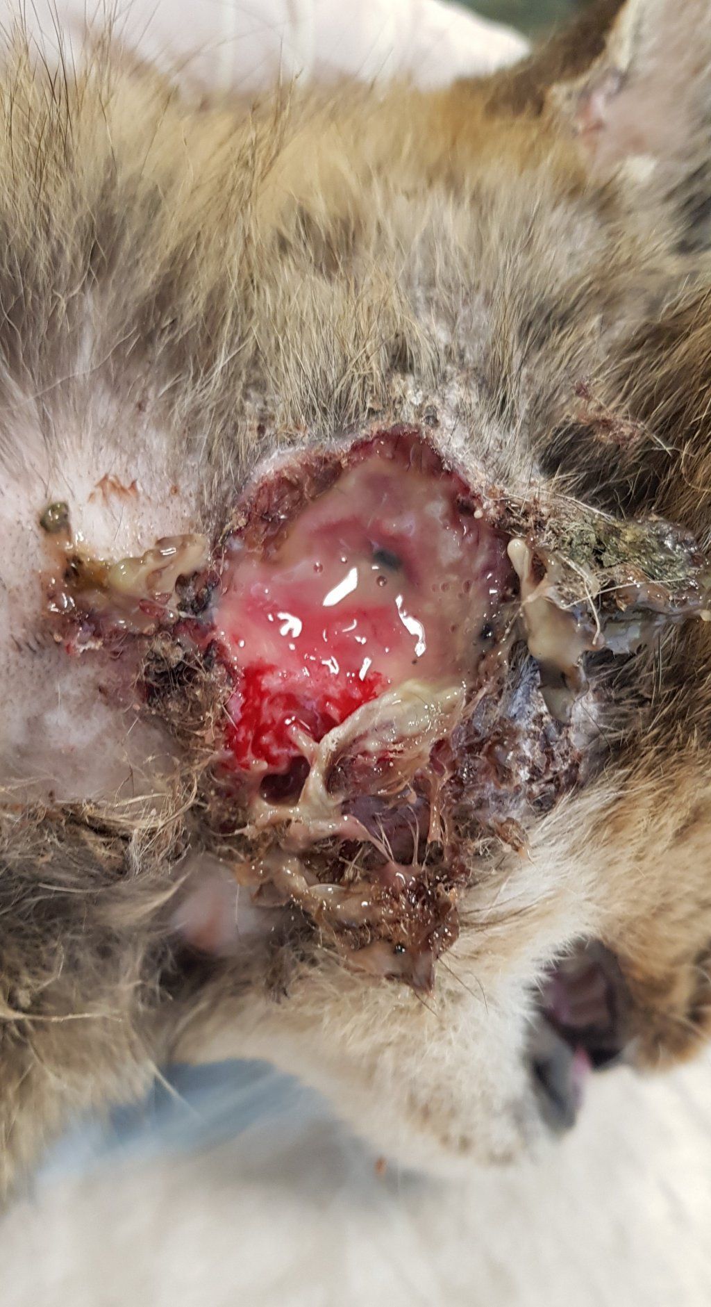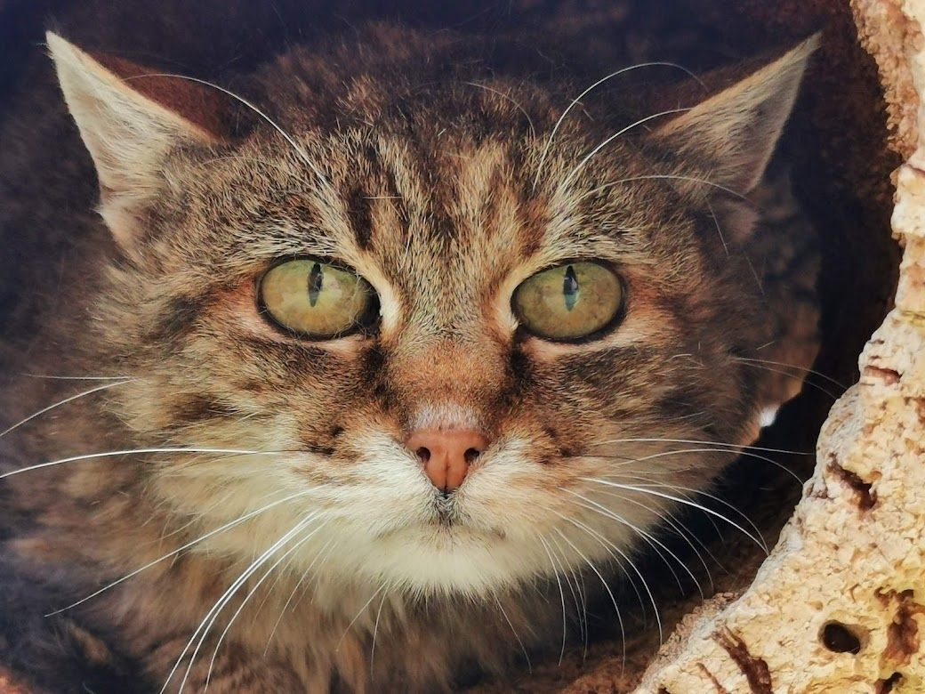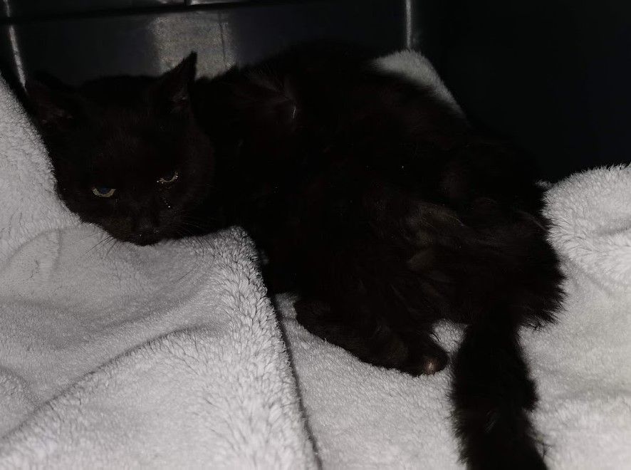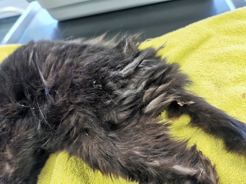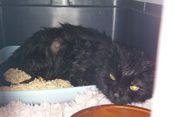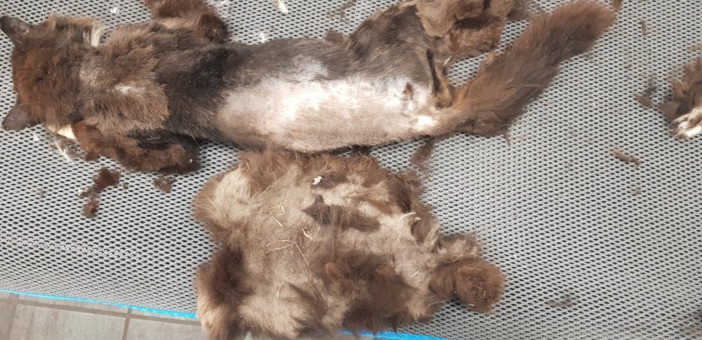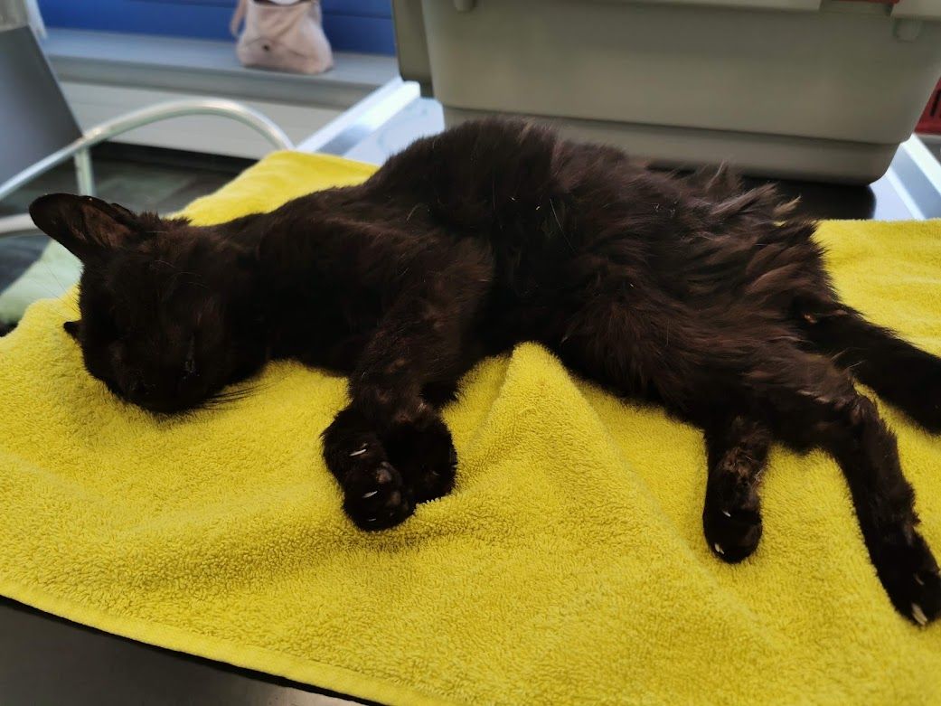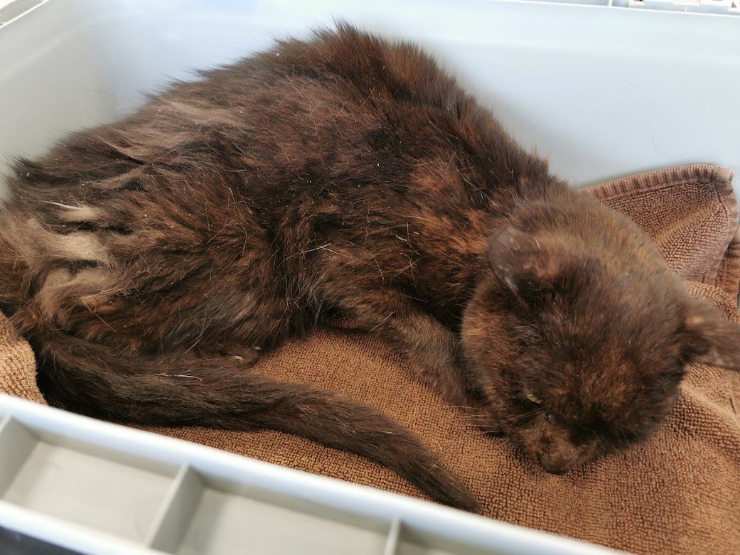 Ein weiterer sehr trauriger Fall hat uns anfangs März 2022 tief bewegt. Wir wurden gebeten beim Einfangen eines älteren Büsis behilflich zu sein, welches vor Jahren zugelaufen war und vor Ort gefüttert wurde. Die Katze blieb trotz der langjährigen Betreuung offensichtlich scheu. Ihr Zustand hatte sich massiv verschlechtert und die Melderin wollte beim Einfangen auf Nummer sicher gehen. Da wir die Katze am Tag nicht zu Gesicht bekamen und wir so ihr Verhalten und Zustand nicht einschätzen konnten, stellten wir eine Falle mit Kamera. Da war ersichtlich, dass die Katze sehr abgemagert und verfilzt war. Sie zeigte auch an der Falle und am Essen keinerlei Interesse, was nichts Gutes verhiess. Als das Büsi abends um 22 Uhr dann in ihrem Bettchen im Vorsprung des Kellerfensters lag, machte ich mich sogleich auf den Weg um mir ein Bild zu verschaffen, ob es eine Möglichkeit gibt, das Büsi ohne Risiko, dass sie abhaut, einzufangen. Die Melderin konnte bis zu ihr hin und sie liess sich auch widerstandslos streicheln. Es schien als habe sie gar keine Kraft mehr um zu fliehen. Da wir keine andere Wahl hatten, schlich ich mich leise heran und drückte schnell den von mir mitgebrachten Deckel meines Samthockers auf die Öffnung. Dieser passte haargenau, denn ich habe genau die gleiche Höhle bei mir und konnte dies vorgängig austesten. Ich kniete dann nieder und presste den Deckel mit der Höhle fest an mich und so konnte ich unter Mithilfe der Melderin hinten ins Auto steigen wo genug Platz war, um das Konstrukt mittels Spannsets zu sichern. Mir fiel ein Stein vom Herzen. (Achtung bitte keinesfalls nachmachen. Dies war eine einmalige Aktion meinerseits und nicht zur Nachahmung empfohlen, da es auf diese Art in den allermeisten Fällen schief laufen würde. Ich habe mir lange überlegt ob ich es wagen soll, ging hier einfach nicht anders. Ich arbeite sonst ausschliesslich mit Fallen um auf Nummer sicher zu gehen). Allerdings ahnte ich schon, dass das arme Büsi in einem sehr schlechten Zustand sein musste, denn sie leistete keinerlei Widerstand. Zuhause angekommen bestätigten sich leider meine Befürchtungen. Vor mir lag ein Häufchen Elend, abgemagert und voller Filz. Trotz ihres Zustandes nahm sie das Wasser und Futter an, was mir wieder etwas Hoffnung gab. Wenige Stunden später düste ich morgens um sieben gleich zum Tierarzt. Und ja, leider war auch Streunerlis Zustand schon so schlimm, dass auch ihr nicht mehr geholfen werden konnte. Sie hatte wohl den Darm schon voller Tumore. Sie hatte blutigen Durchfall und die Augen tränten. Ganze zwei Stunden habe ich noch bei Streunerli verbracht und mit ihr geschmust, bevor sie in meinen Armen über die Regenbogenbrücke gegangen ist. Auch das Schicksal von Streunerli hat mich emotional wieder sehr mitgenommen. Es gibt nichts Schlimmeres als ein Tier sichern aber nicht mehr helfen zu können. Solche Fälle gehen mir mittlerweile schon so nahe, dass ich sie kaum mehr ertragen kann. Ich bin einfach nur fassungslos und sprachlos ab der Gleichgültigkeit und Untätigkeit unserer Politiker und zuständigen Ämter, welche wissentlich zum grossen Katzenelend in unserem Land beitragen.