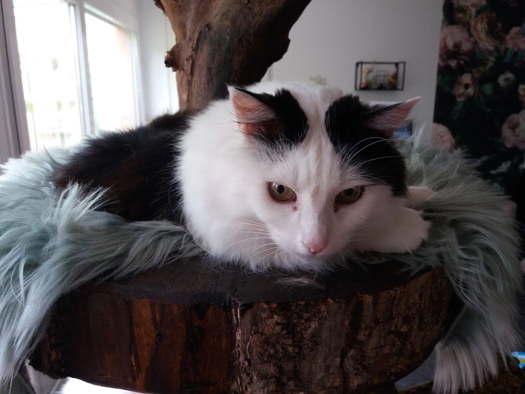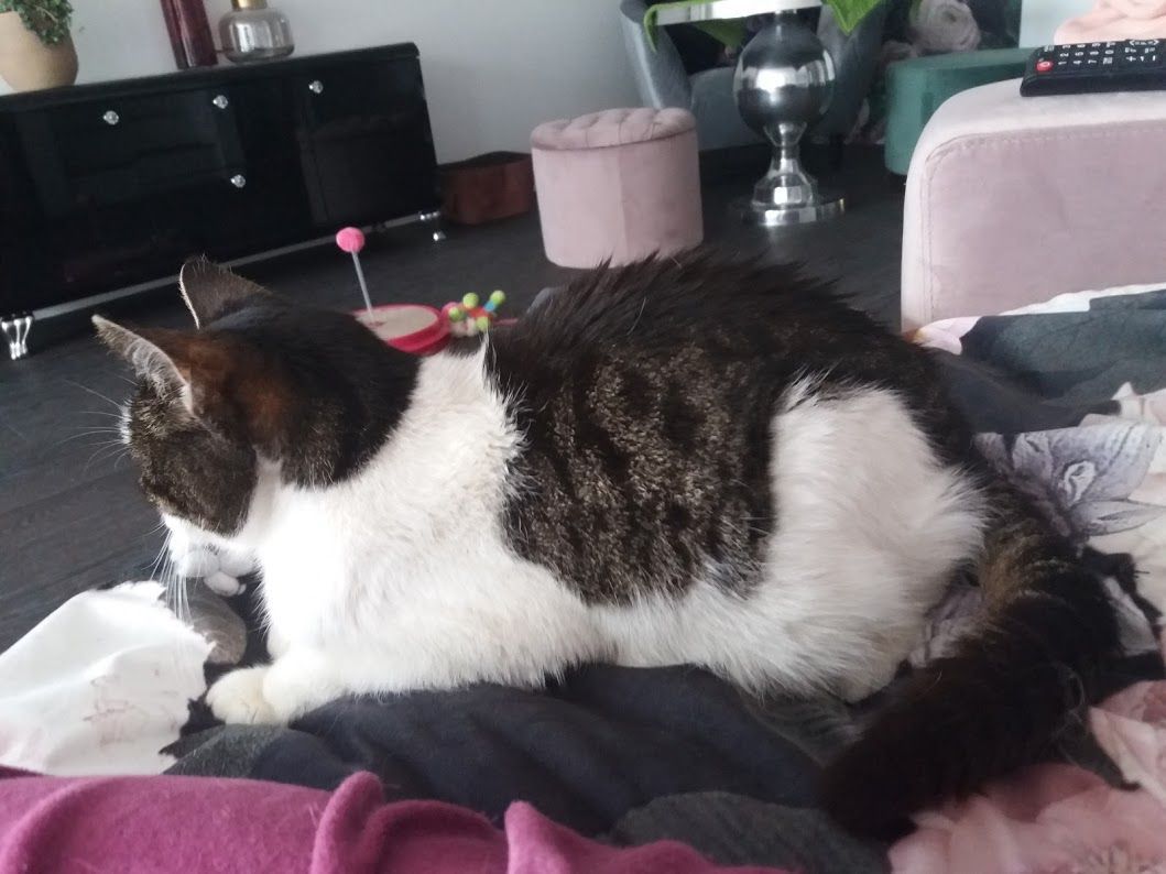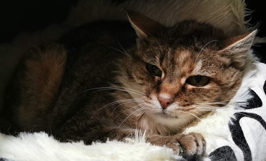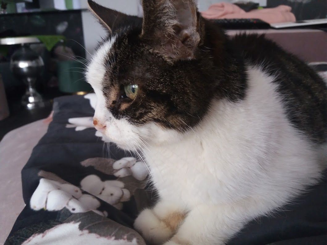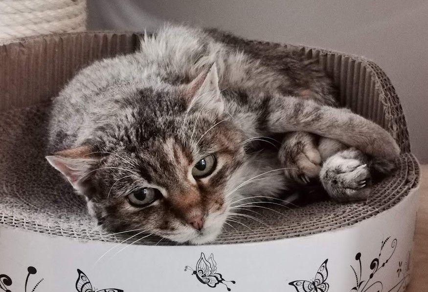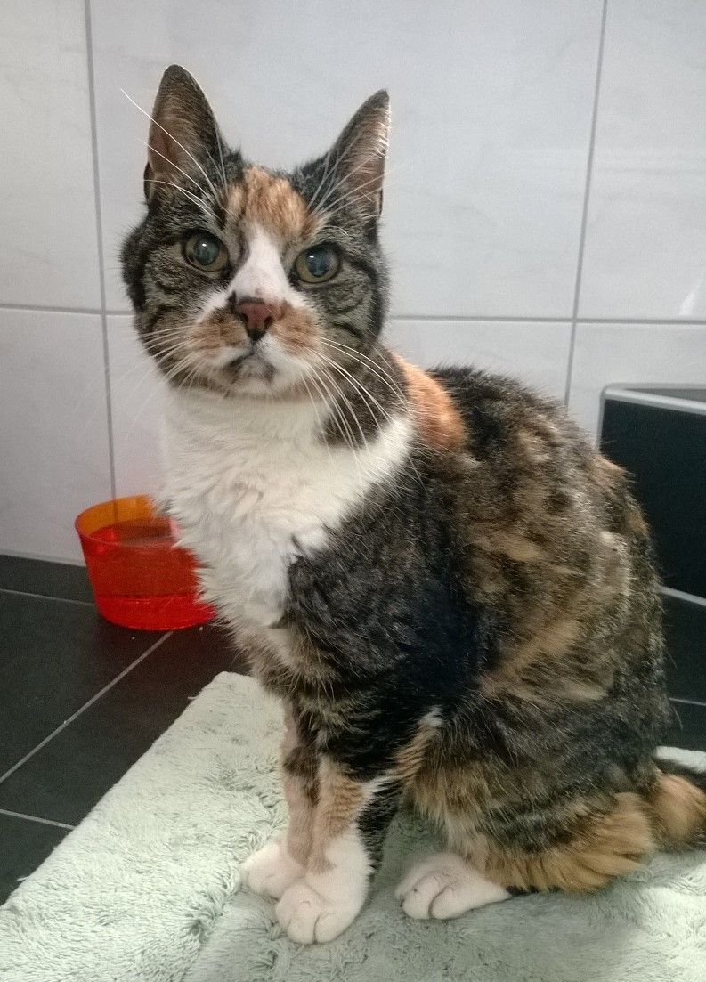 Mascha lief Mitte Dezember 2020 bei den Meldern zu. Da sie in einem schlechten gesundheitlichen Zustand war und Nachfragen in der Umgebung keine Hinweise auf Besitzer ergaben, fingen sie an sie zu füttern. Leider konnten sie sie nicht einfangen und so vergingen weitere drei Wochen, bis wir sie am 9. Januar dieses Jahres sichern konnten. Die Katzendame ist schon ein älteres Semester und leidet an einer Schilddrüsenüberfunktion, ist taub und benötigt aufgrund ihrer massiv fortgeschrittenen Spondylose auch noch regelmässig Schmerzmittel. Ursprünglich war es der Plan, Mascha an einen Einzelplatz zu vermitteln, da sie mit den anderen Katzen nicht sonderlich verträglich ist und sie diese regelmässig in die Schranken weist. Eine Vermittlung ist gescheitert, da sie in ihrem neuen Zuhause anscheinend regelmässig auf Bett und Sofa gemacht hat und die ganze Nacht geschrieen haben soll. Dass Mascha schnell Stress hat, zeigte sich schon bei den kurzen Tierarztfahrten. Dass der Umzug allerdings solche Auswirkungen hat, konnten wir nicht ganz nachvollziehen, denn bei uns ruft sie zwar, wenn es ums Essen geht, ansonsten ist sie aber eine ruhige Mitbewohnerin, die viel schläft. Ausserdem ist sie bei uns absolut sauber und hat noch nie neben das Kistchen gemacht.