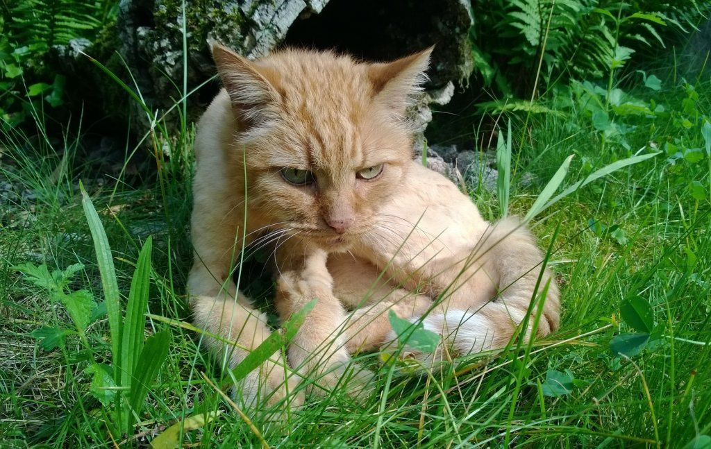 Kater Flumi kam am 26. Juni 2019 als Findelkater zu uns. Auch er, wie die meisten unserer Schützlinge, noch unkastriert und in verwahrlostem Zustand. Er wurde schon seit Jahren von einer Familie gefüttert, war aber im Gegensatz zu den anderen zugelaufenen Katzen bisher fallenresistent. Es gelang nun endlich ihn einzufangen indem er in der Gartenlaube eingeschlossen werden konnte. Mittels Kescher war er dann schnell im Korb. Er wurde kastriert und von seinem Filzpanzer befreit. Flumi hat aber noch weitere Baustellen, nebst seinem Gebiss wurde er vermutlich auch vor einigen Jahren angefahren. Sein linkes Vorderbein wurde dabei wohl gebrochen und ist mangels tierärztlicher Versorgung schief zusammengewachsen. Da auch Flumi Menschen gegenüber nicht sozialisiert ist und aufgrund des Zustandes praktisch unvermittelbar, werden wir versuchen ihn über den Winter in unseren Bestand zu integrieren und hoffen, dass er etwas an Vertrauen gewinnt. Er spricht gut auf Bachblüten an und auch seine geliebten Fleischsticks lassen ihn manchmal seine Scheu etwas vergessen.