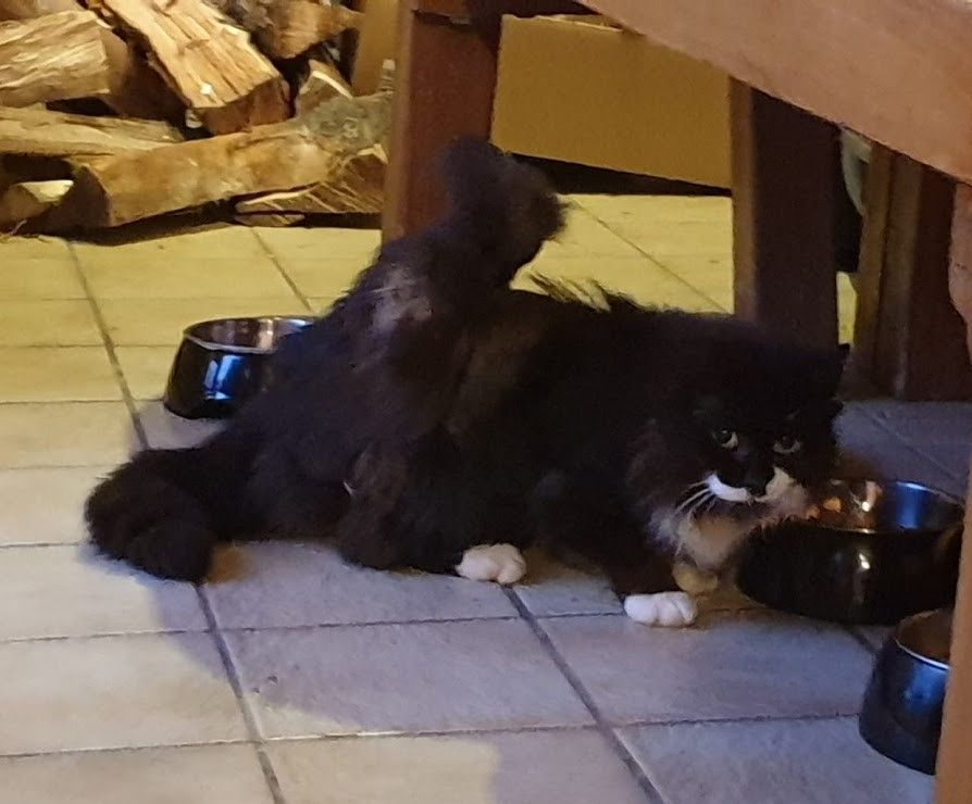 Der ca. 10 jährige Kater Pfüdi kam am Ende Januar 2020 aus einem verwahrlosten Katzenbestand eines Bauernhofes zu uns. Er hatte eine Kopfschiefhaltung infolge vereiterter Ohren, verursacht durch faule Zähne. Pfüdi hat sich soweit gut erholt, leidet aber nach wie vor unter chronischem Schnupfen und auch seine Verdauung ist aufgrund der langjährigen schlechten Ernährung angeschlagen. Auch Pfüdi hat sich bei uns so super eingelebt und ist extrem sozial zu seinen Gspänli. Vor allem unseren 'Sozialarbeiter' Peppino liebt er heiss und innig. Damit hat auch er sein Bleiberecht erwirkt. Bei Pfüdi wurde Anfang Mai 2021 Diabetes diagnostiziert, so dass wir ihn nun 2 Mal am Tag spritzen müssen.