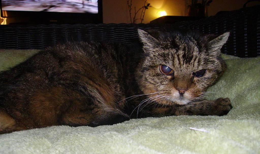 Tabea kam als letzte Samtpfote zu mir, ebenfalls als Findling. Sie wurde mir an einem Abend anfangs Dezember 2008 von der Feuerwehr gebracht, die gerade zu einer Übung ausrücken wollte. Tabea sass regungslos auf der Kreuzung der Hauptstrasse wenige Meter von meinem Haus entfernt und bewegte sich auch nicht als Autos an ihr vorbeifuhren. Auch hier war schnell klar, dass sie blind ist. Angesichts des schlechten Zustandes, sie war total abgemagert und verfilzt, brachte ich sie umgehend ins Tierspital. Dort wurde sie 4 Wochen lang aufgepäppelt, gegen ihren hohen Blutdruck und die Überfunktion der Schilddrüse behandelt. Nun geniesst Tabea ihren Lebensabend bei mir.