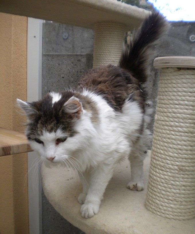Lea kam erst im letzten Herbst zu mir. Sie war damals trotz ihres hohen Alters noch fit wie ein Turnschuh und sprang wie eine Feder auf die Kratzbäume. Lea integrierte sich schnell in meine Gruppe und verschaffte sich mit kurzem Gefauche den nötigen Respekt, wenn ihr eine andere Katze näher kam als ihr lieb war. Lea war eine sehr verschmuste und anhängliche Katze, die jede Streicheleinheit in vollen Zügen genossen hat. Solange das Wetter noch schön war, verbrachte sie viele Stunden im Aussengehege und liess die Sonne sie wärmen.