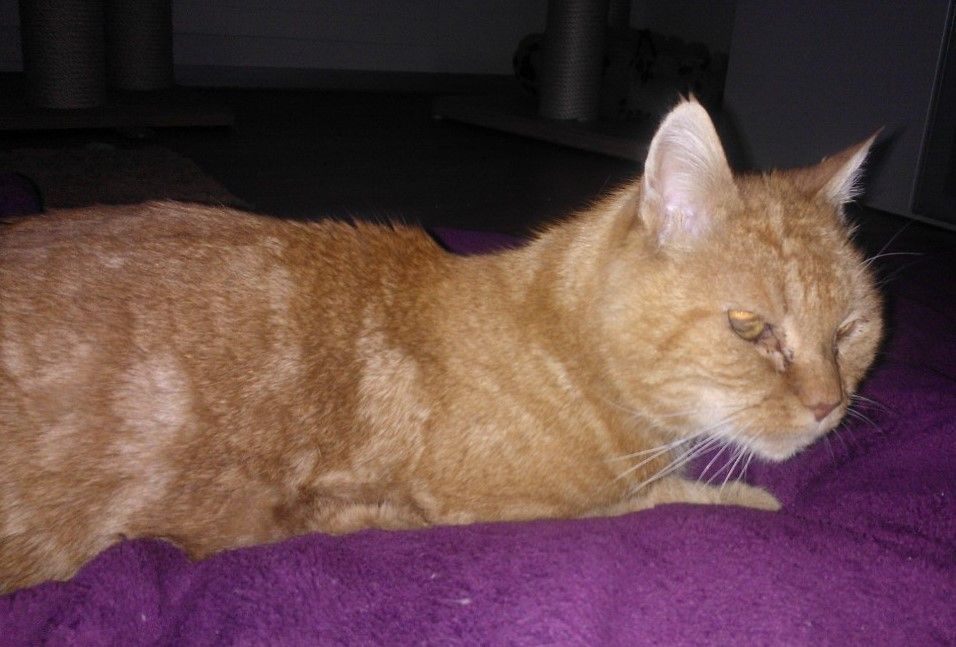 Auf Kater Bärli wurden wir aufgrund einer Stmz Fundmeldung aufmerksam. Die Melderin hatte ein Foto hochgeladen und erwähnt, dass die Katze orientierungslos sei und immer zurückweichen würde, sobald man sich ihr nähert. Aufgrund des Verhaltens und des Fotos mit den geweiteten Pupillen kam bei mir sofort der Verdacht auf, dass die Katze blind sein könnte. Ich nahm an diesem Samstag, 8. Februar 2014, am Nachmittag sofort mit der Melderin Kontakt auf. Sie meinte, die Katze sei leider bereits wieder weitergezogen. Trotzdem fuhr ich sofort nach Wohlen und lief mehr als eine Stunde suchend und herumfragend durchs Einfamilienhausquartier. Zwei Anwohner berichteten mir, dass sie die Katze bereits seit einer Woche sehen würden und sie auch immer gegen Mauern laufen würde. Damit bestätigte sich mein Verdacht einer Blindheit. Ich wollte schon fast aufgeben, beschloss aber dann mittels Auto noch etwas grössere Kreise zu ziehen und am Ende der Quartierstrasse auf dem Weg hoch auf der anderen Seite eines kleinen Baches erspähte ich eine rote Katze. Sofort fuhr ich zur Hauptstrasse über die Brücke und stellte mein Auto kurzerhand auf einen Parkplatz vor einem Wohnblock, schnappte den Katzenkorb, eine Decke und machte mich suchend auf den Weg auf welchem ich die Katze gesichtet hatte. Ich sah gerade noch, wie sie vom Weg durch ein geöffnetes Gartentor auf die Wiese eine Wohnblockes zusteuerte. Leider wich die Katze auch bei mir immer wieder aus sobald ich mich ihr näherte. Ich rief einer Beobachterin auf dem Balkon des Blockes zu ob sie mir zu Hilfe kommen könnte, was sie dann auch tat. So gelang es uns zu zweit die Katze zwischen Pflanzenbord und Sitzplatz im Eck einzukreisen, so, dass ich den Korb über sie stülpen und ein Brett darunter schieben konnte um den Korb zu drehen. Ich war sehr erleichtert, es geschafft zu haben. Der Kater war tatsächlich blind, es gab keine Hinweise auf einen Besitzer im Quartier und leider stellte sich bei der tierärztlichen Untersuchung heraus, dass er einen sehr grossen Tumor im Bauch hatte. Bärli, wie ich ihn taufte, war ein so dankbarer, lieber und verschmuster Kater und es tat mir in der Seele weh, dass ihm nicht schon früher geholfen werden konnte. Wer weiss, wie lange er schon in diesem Zustand suchend herumlief und die Leute einfach weg schauten. Leider durfte Bärli nur noch wenige Wochen unter uns sein, denn sein Tumor wuchs sehr schnell und so mussten wir ihn am 25. Februar 2014 von seinem Leider erlösen.